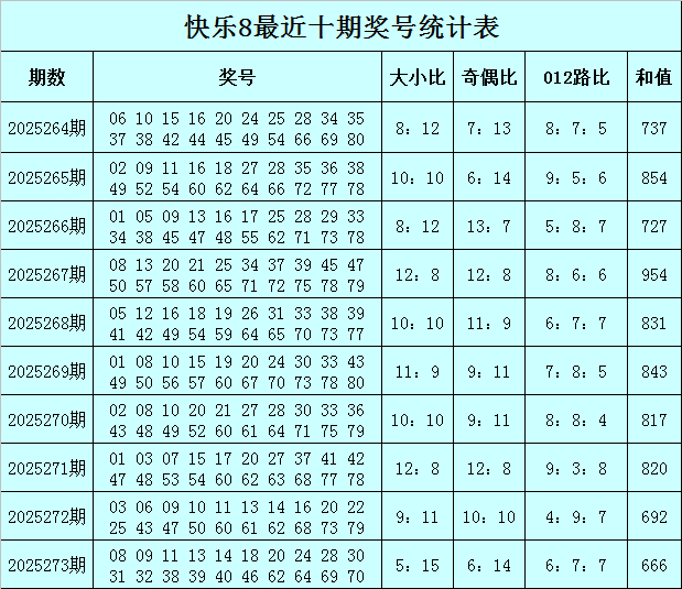 福彩自豪8第2025273期开奖回来:08 09 11 13 14 18 20 24 28 30 31 32 38 39 40 46 62 64 69 70,其中奖号奇偶比开出6:14,大小比开出5:15,012路比开出6:7:7,和值为666,跨度为62。
